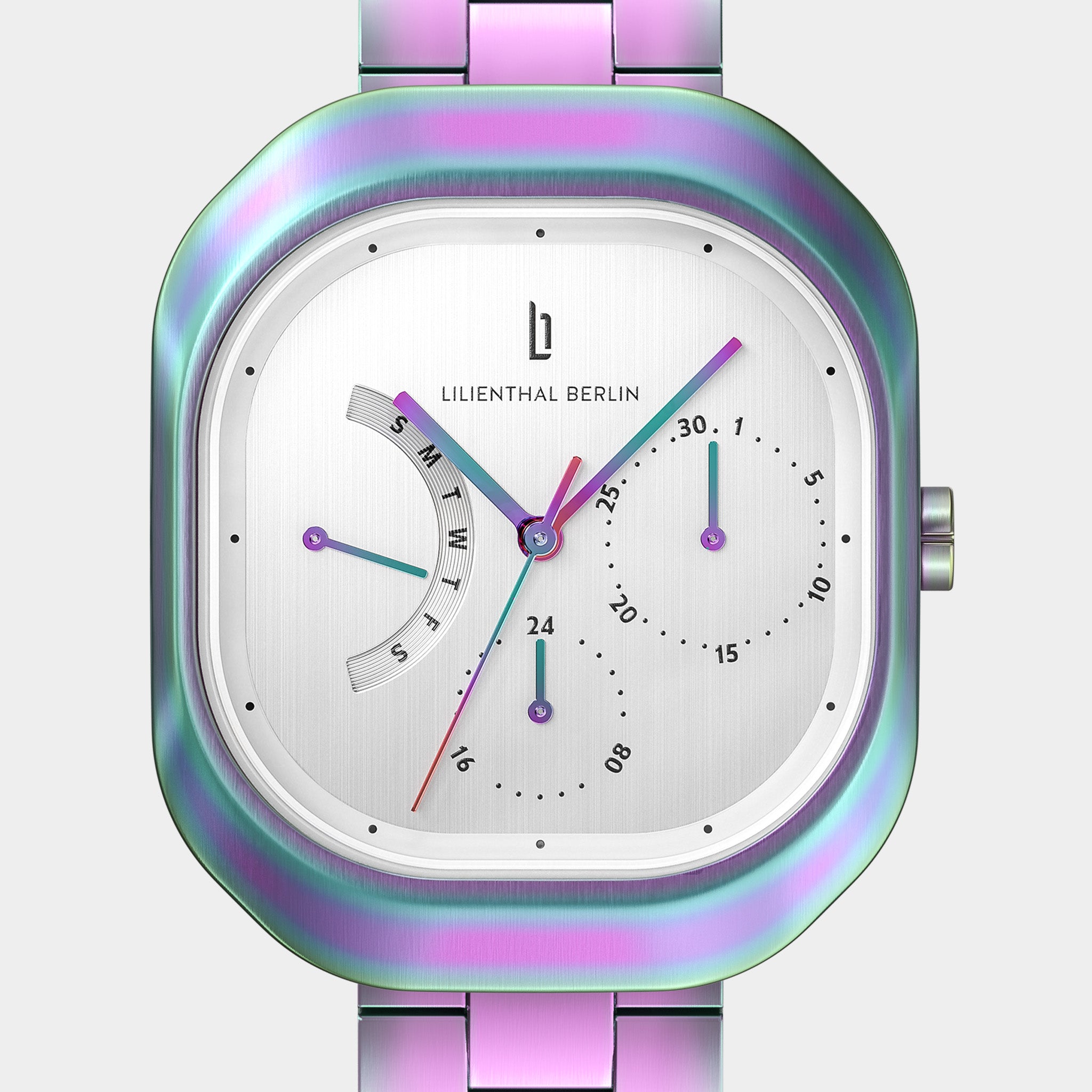- Effetto di brillantezza iridescente: La finitura della cassa e il quadrante hanno un effetto cromatico unico. Con lancette sottili, piccoli elementi Superluminova e indicazioni di data e giorno, il design presenta una certa complessità pur essendo perfettamente leggibile.