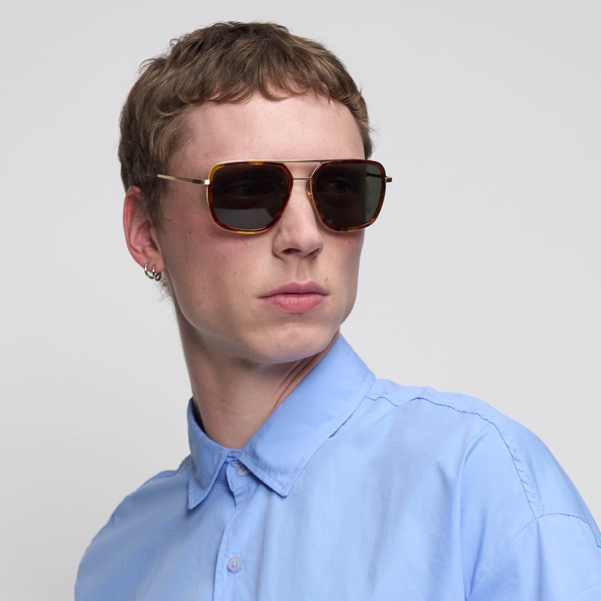 - Aviator revisité : Monture à la coupe large et au design plat, avec des verres gris-vert – encadrés d’acier inoxydable doré brossé et de bio-acétate brun à l’aspect havane.
