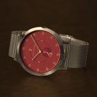 - Ikonisches Design: Mattrotes Zifferblatt, 42,5 mm Gehäuse in Gold mit eingelassener Krone und Mesh-Wechselarmband - hier trifft Stil auf Funktionalität.