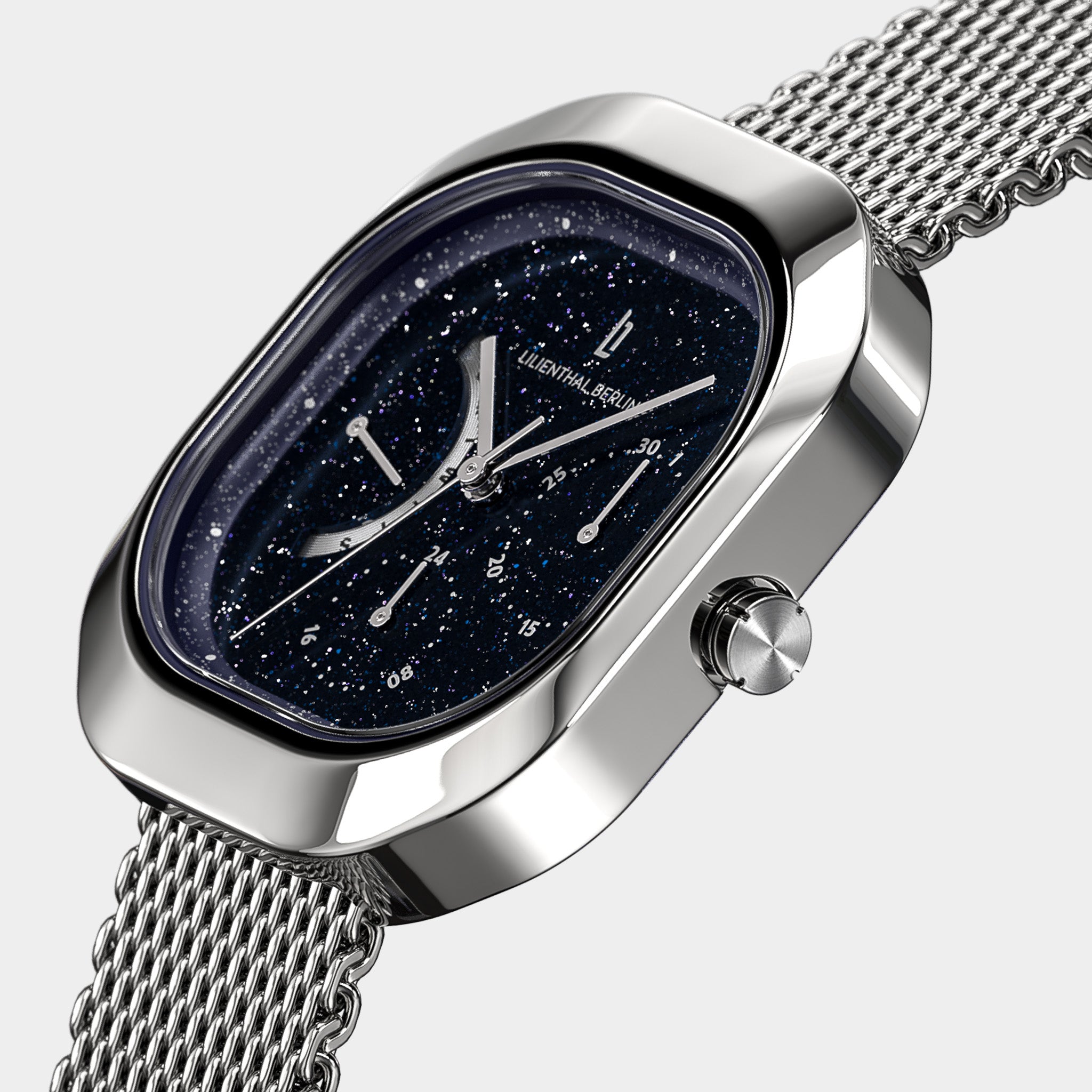- Effet brillant raffiné : Le cadran est recouvert d'une surface cristalline, de sorte qu'il scintille à chaque mouvement. Avec des aiguilles délicates, de petits éléments Superluminova et les affichages de la date et du jour, il présente une certaine complexité tout en restant parfaitement lisible.